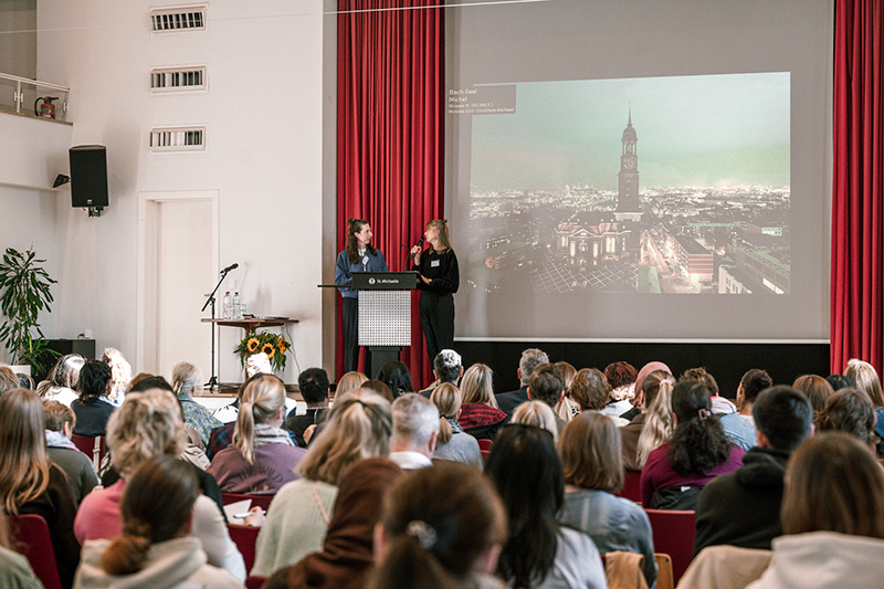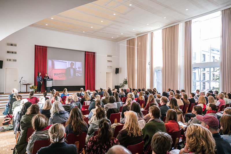 Nach einer Videobotschaft von Dr. Dirk Bange (Behörde für Schule, Familie und Berufsbildung) und der Begrüßung durch die Moderatorin Marjan van Harten sowie die FrüBiS-Projektleitung Amelie Kruft eröffneten inspirierende Impulsvorträge von Prof. Dr. Karim Fereidooni, Prof. Dr. Bernd Meyer und Prof.in Dr.in Drorit Lengyel den Tag. Bereits beim Einlass konnten die Teilnehmenden den Markt der Möglichkeiten besuchen – eine Ausstellung mit Materialien, Methoden und Praxisbeispielen. In der Mittagspause bot ein leckeres Catering von Chickpeace Zeit für Austausch und eine weitere Gelegenheit, den Markt zu erkunden.