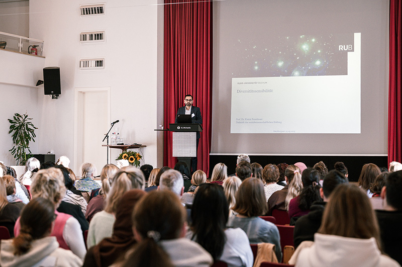In seinem Vortrag sprach Prof. Dr. Karim Fereidooni darüber, wie in unserer Gesellschaft in unterschiedlichen Bildungsinstitutionen bestimmte Vorstellungen von „Normalität“ entstehen. Er machte deutlich, welche Probleme dabei entstehen können – denn durch diese Vorstellungen können Menschen ausgeschlossen werden. Außerdem stellte er verschiedene Theorien und Studien zum Thema Diversitätssensibilität vor. Er zeigte Maßnahmen, die darauf angelegt sind, mit Diversität konstruktiv umzugehen.